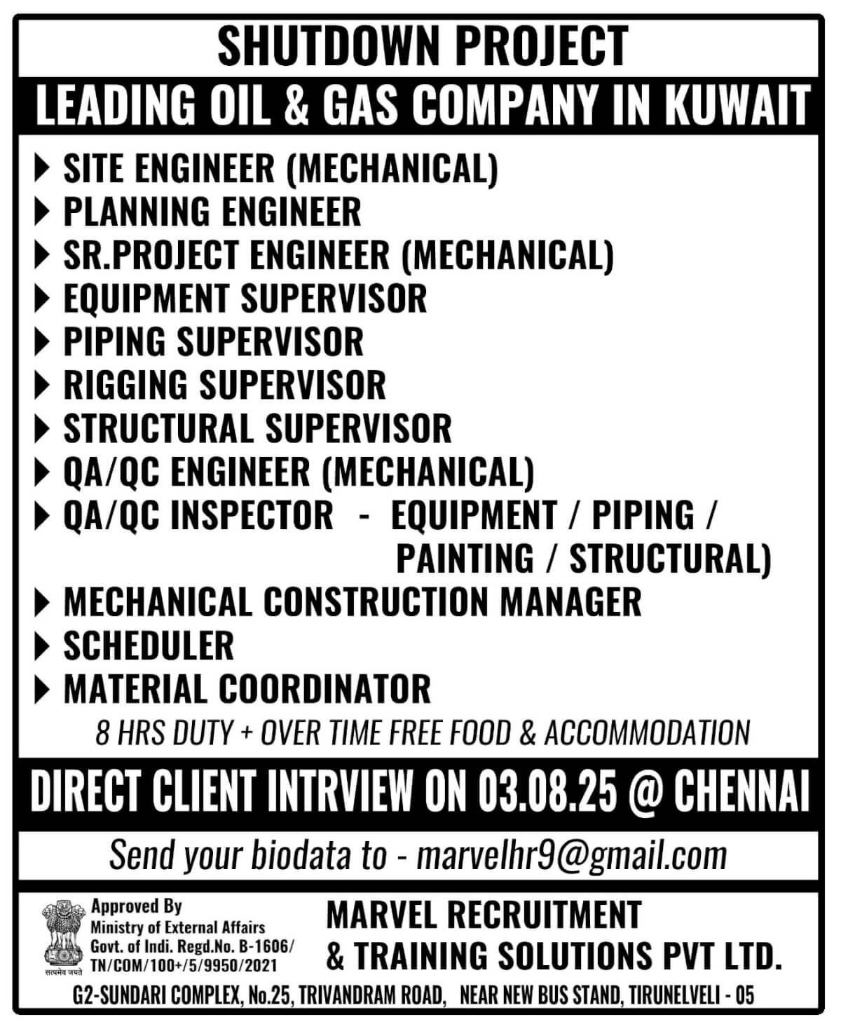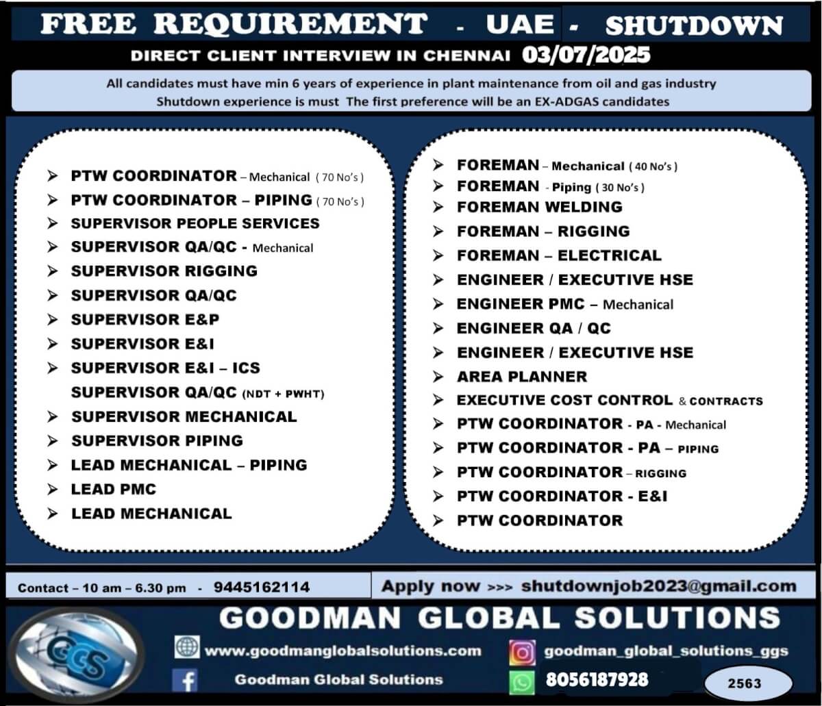EQUATE SHUTDOWN – TISD - KUWAIT SHUTDOWN PROJECT - ONLINE INTERVIEW - CV Shortlisting Under Progress CONTACT -7305064086 APPLY NOW>>> ggsrecruiter001@gmail.com SALARY - 550 - 1000 KD + OT - FREE FOOD, ACCOMMODATION, MEDICAL &...