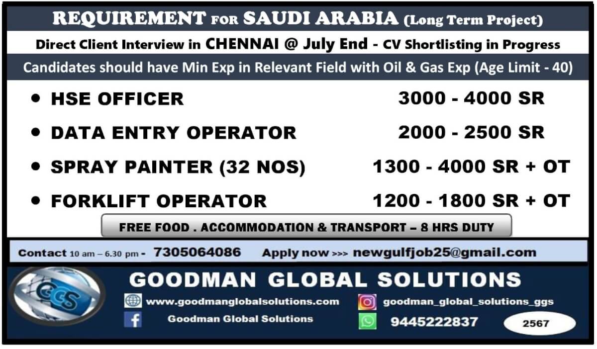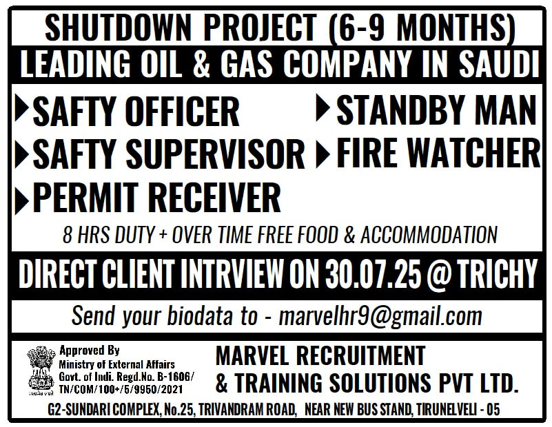 SAUDI ARABIA - OIL & GAS PROJECT ( LONG TERM ) ONLINE INTERVIEW - 3rd Week December Candidate should have min 1 - 3 years exp with oil & Gas orPetrochemical (NEBOSH - IGC certified Mandatory) CONTACT -7200630154 APPLY NOW>>> ...