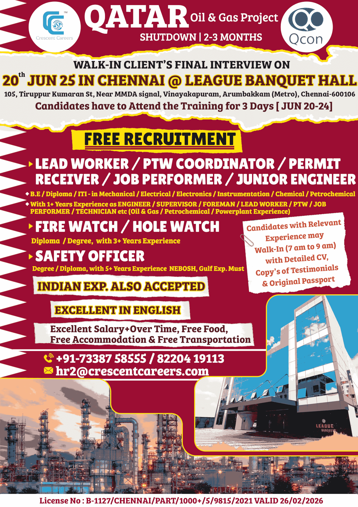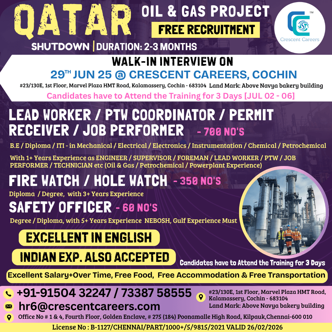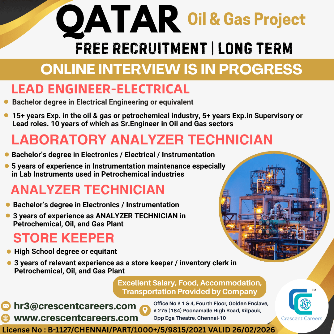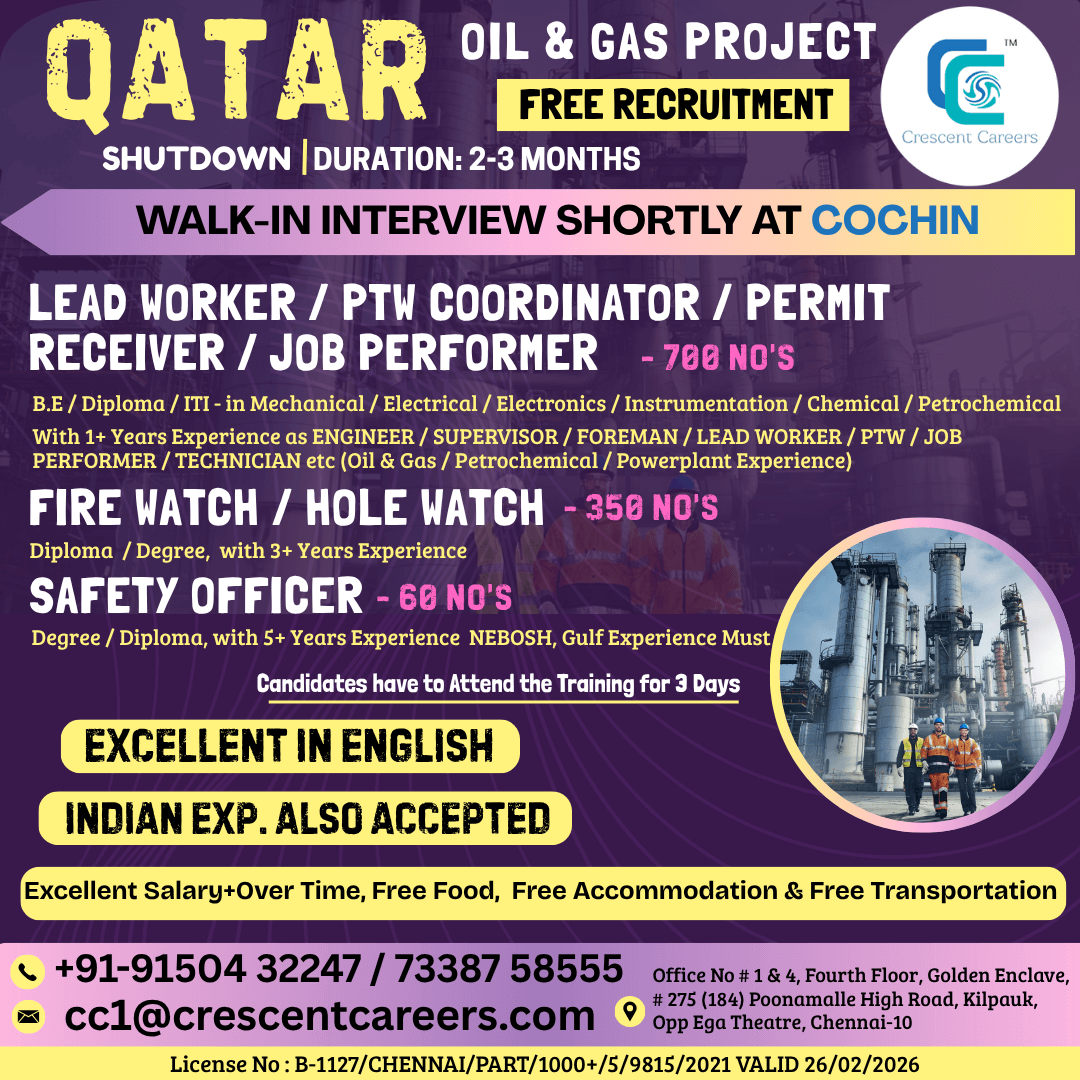 Hiring for Oil & Gas Project in QATAR LONG TERM WALK-IN CLIENT'S FINAL INTERVIEW AT TRICHY, CHENNAI, VIZAG Contact: +91-73387 58555 / 81223 11890 / 81222 68855 Send CV to: hr2@crescentcareers.com