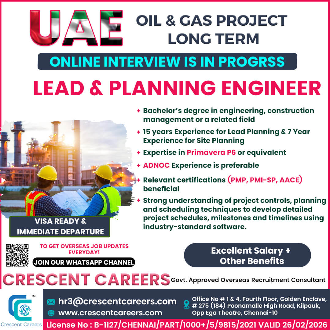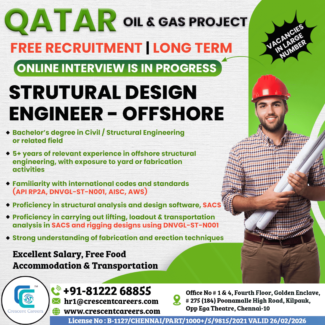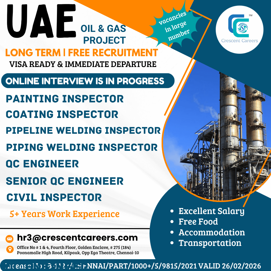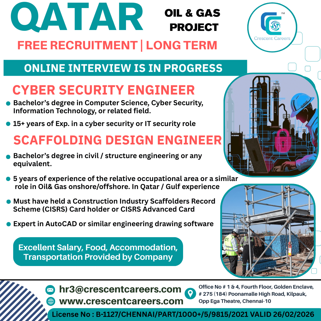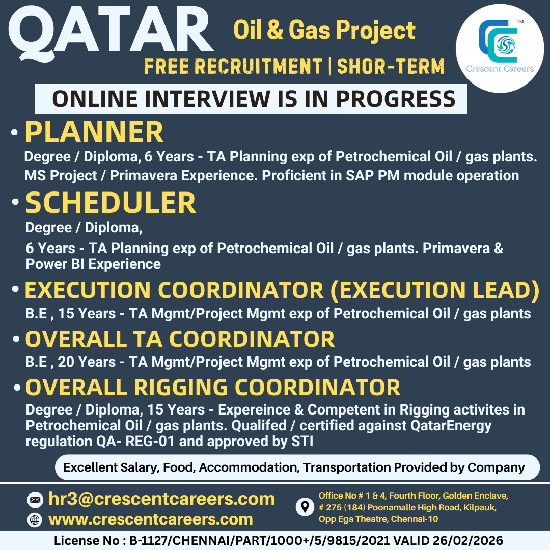 Hiring for Oil & Gas Project in QATAR LONG TERM WALK-IN CLIENT'S FINAL INTERVIEW AT TRICHY, CHENNAI, VIZAG Contact: +91-73387 58555 / 81223 11890 / 81222 68855 Send CV to: hr2@crescentcareers.com