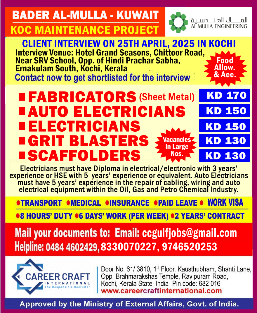 BEMCO BASED IN BAHRAIN REQUIRES CANDIDATES FOR HOSPITAL MAINTENANCE PROJECT. CLIENT INTERVIEW AT KOCHI ON 20TH DECEMBER, 2025. INTERESTED CANDIDATES ARE REQUESTED TO ATTEND THE INTERVIEW ACCORDINGLY