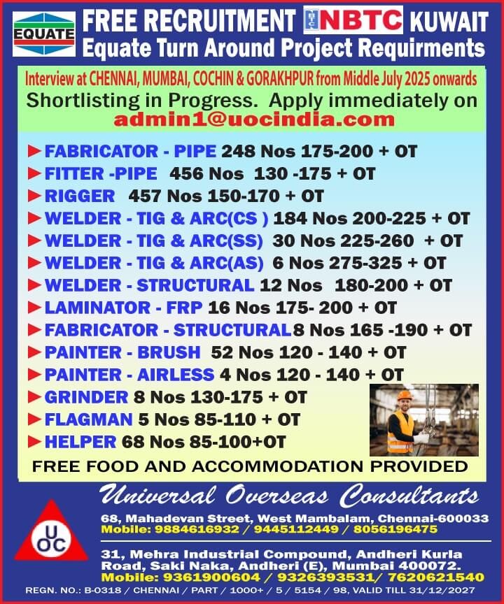 ? KOC Kuwait Long-Term Job Openings ? Interviews in Chennai, Cochin, Mumbai, Surat & Vadodara – Dec 2025 Immediate Departure | Apply Now: kuwait@uocindia.com #KuwaitJobs #OilAndGasCareers #ConstructionJobs #GulfJobs #OverseasJobs #LongTermProjects #KOCRecruitment...