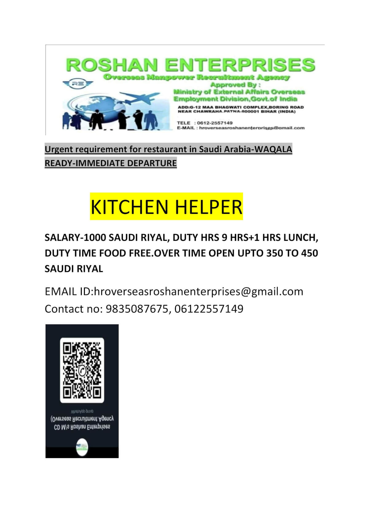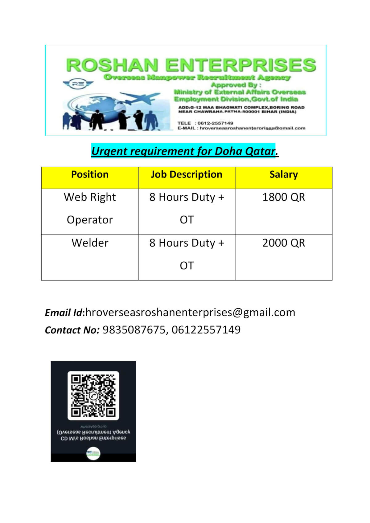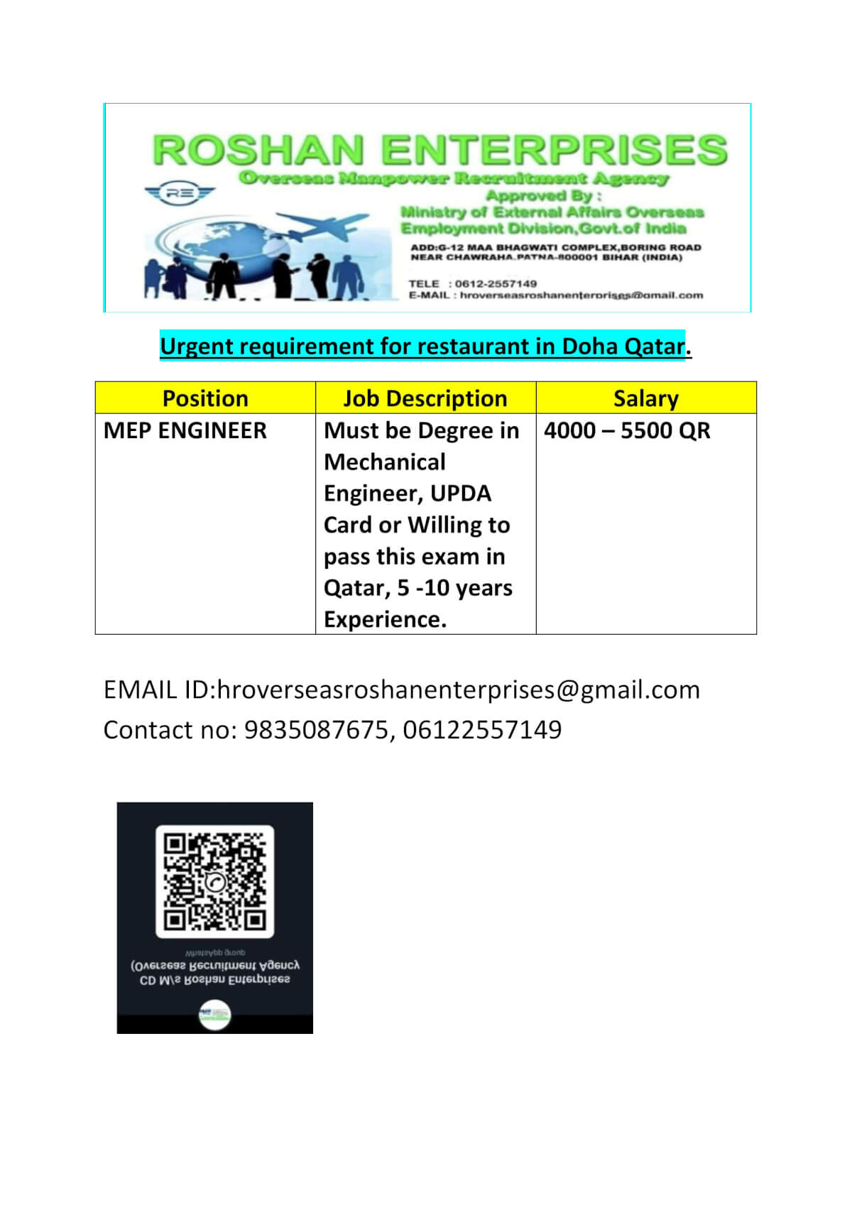 QATAR(DOHA) 1.waiter For Restaurant-1200/ QATAR RIYAL-FREE FOOD 2. SERVICE CAPTAIN 1500/-1700/-QATAR RIYAL FREE FOOD 3.INDIAN...