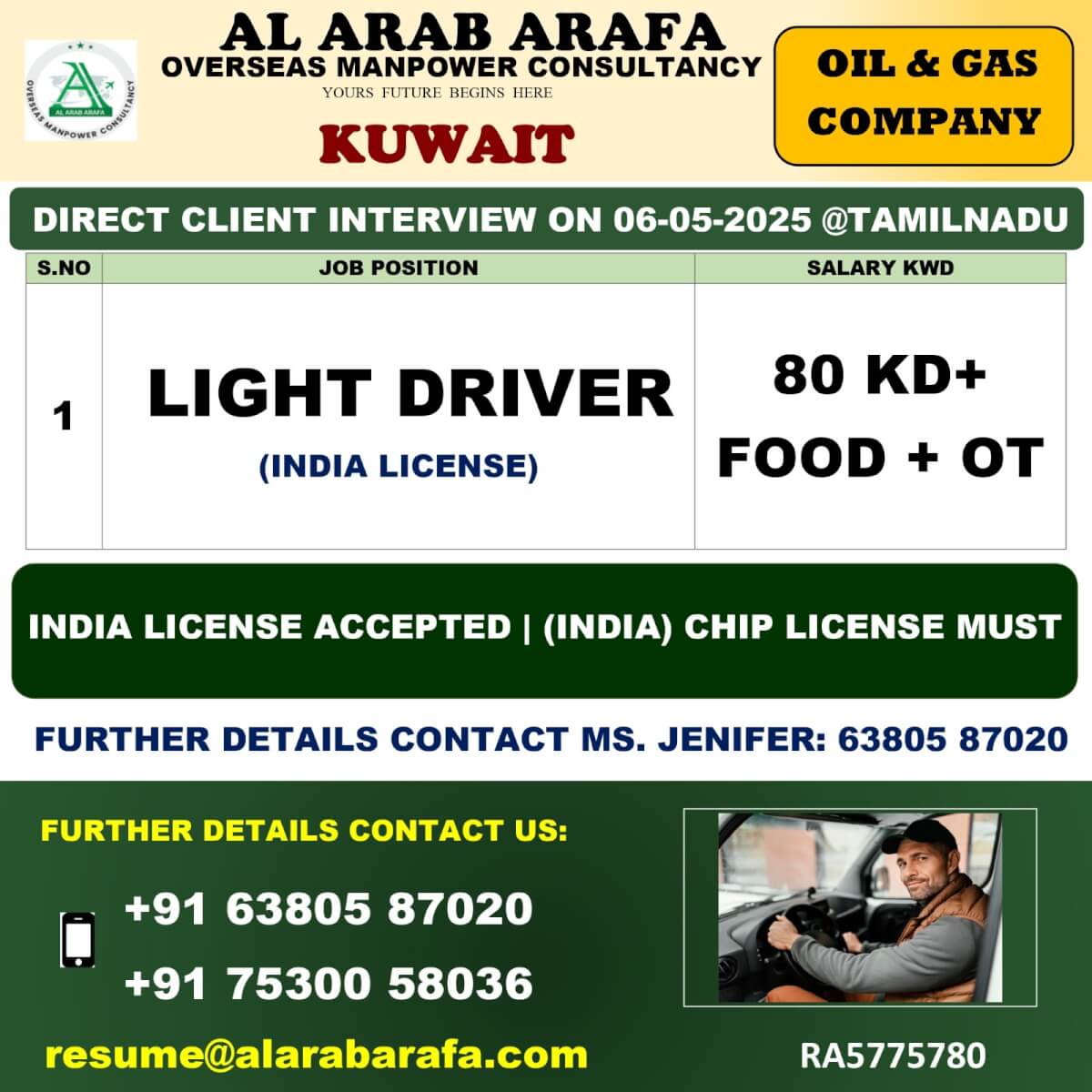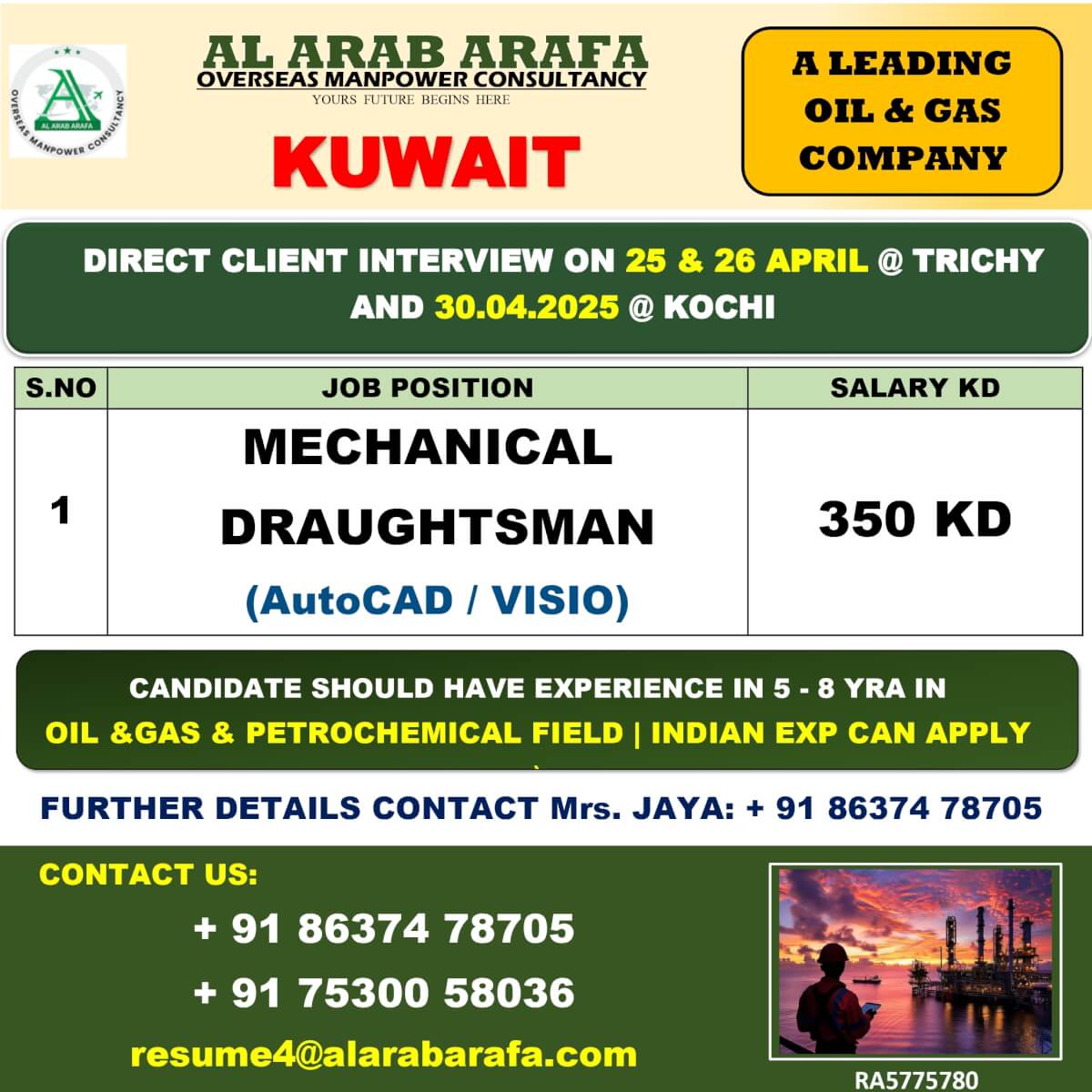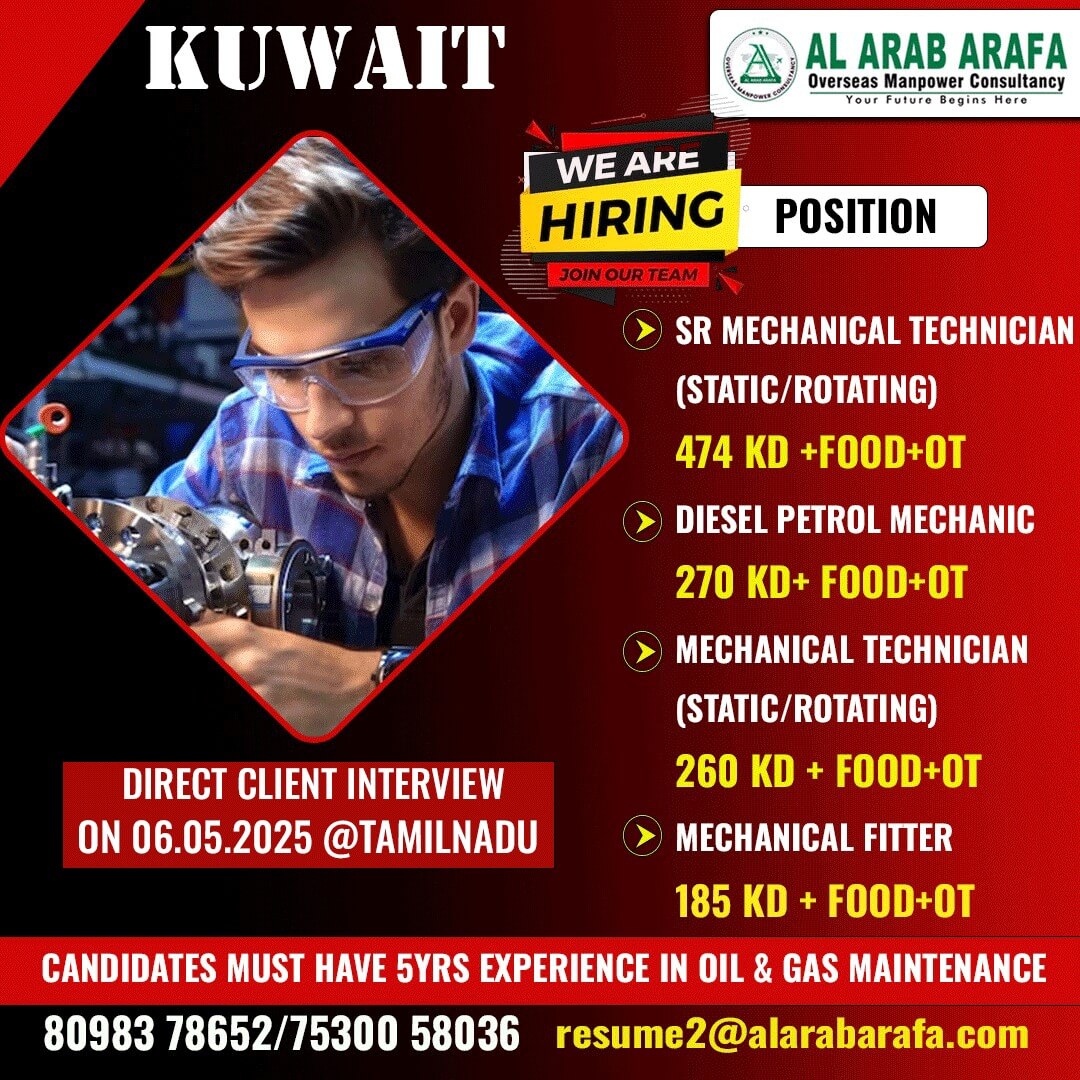 FURTHER DETAILS KINDLY CONTACT MS GAYATHRI : 8610502389 resume5@alarabarafa.com