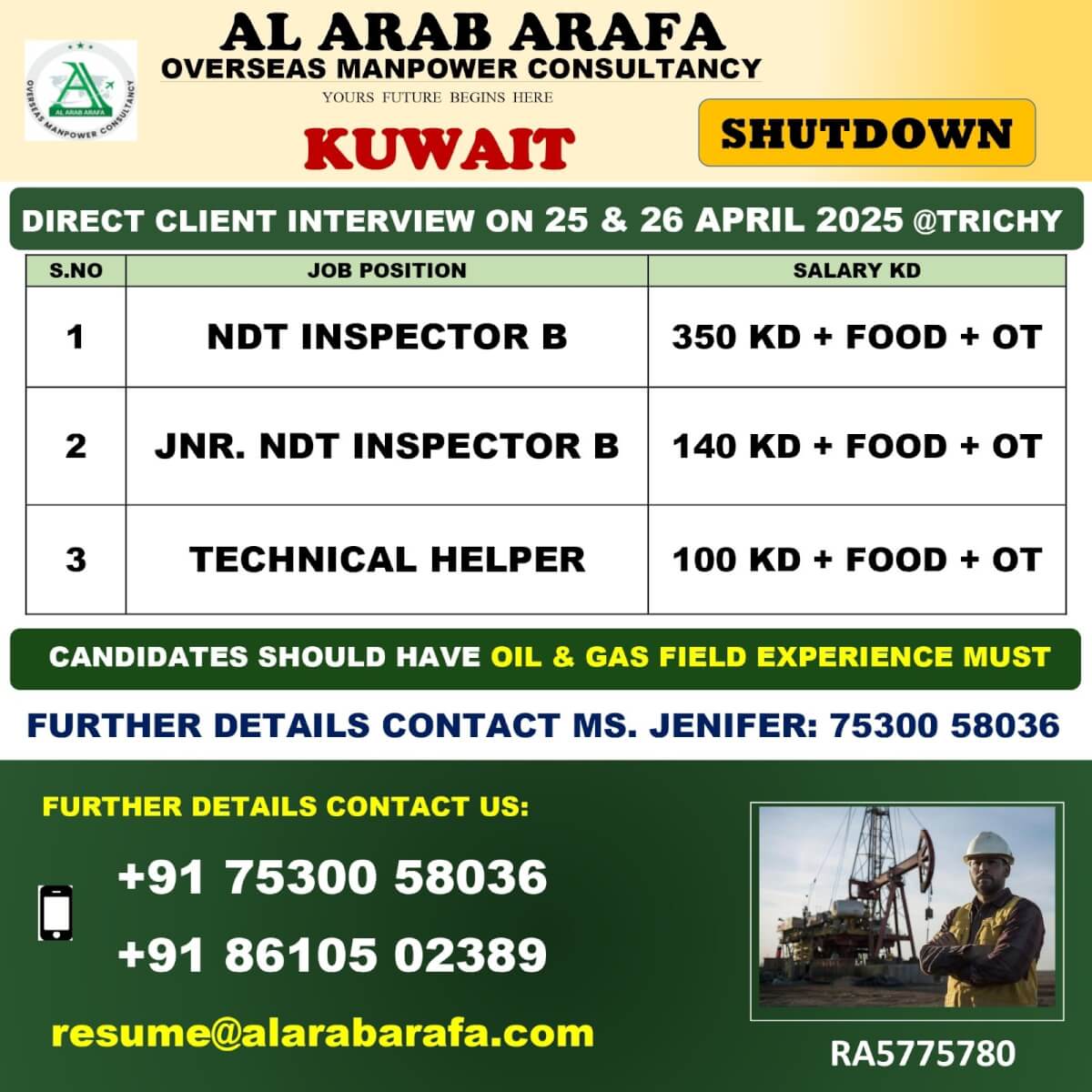 FURTHER DETAILS KINDLY CANTACT MS:NJENIFER 7530058036 resume@alarabarafa.coom