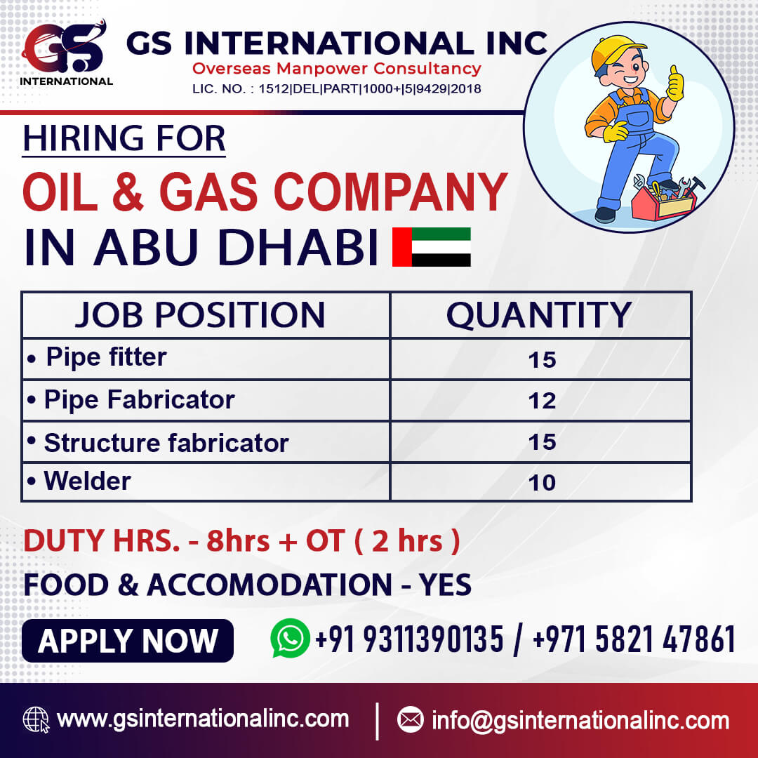 HIRING FOR ABU DHABI Position - Pipe Fitter                  Pipe Fabricator Accommodation and Transportation -  Provided by Company Food  -  Provided by Company Experience -  2yrs Work Schedule  -  08 hours Overtime -  Yes DROP YOUR CV CONTACT...