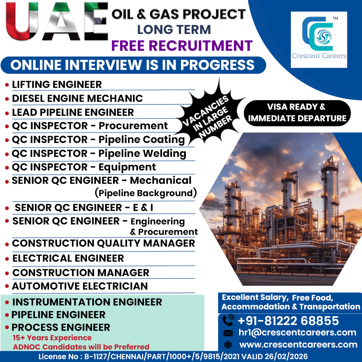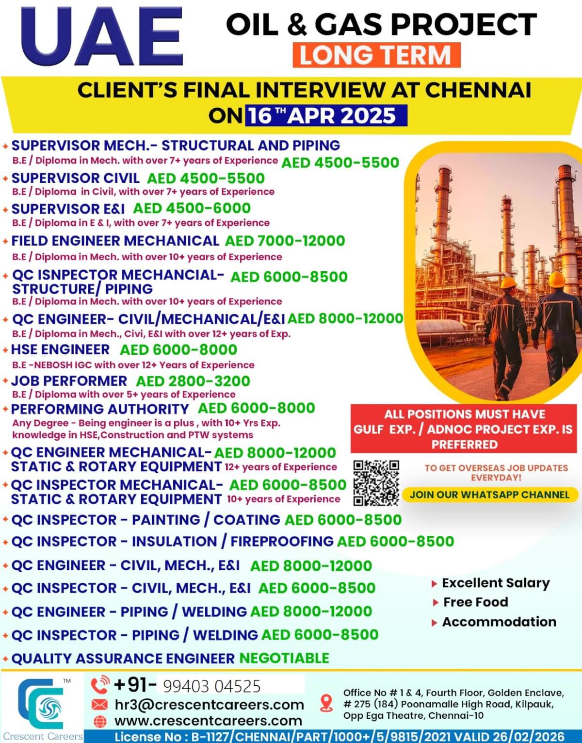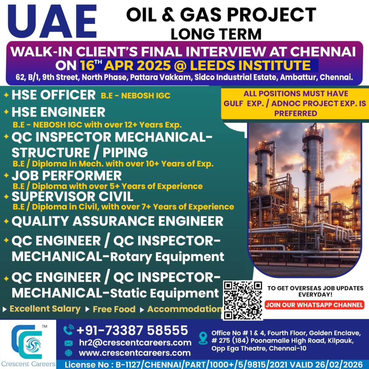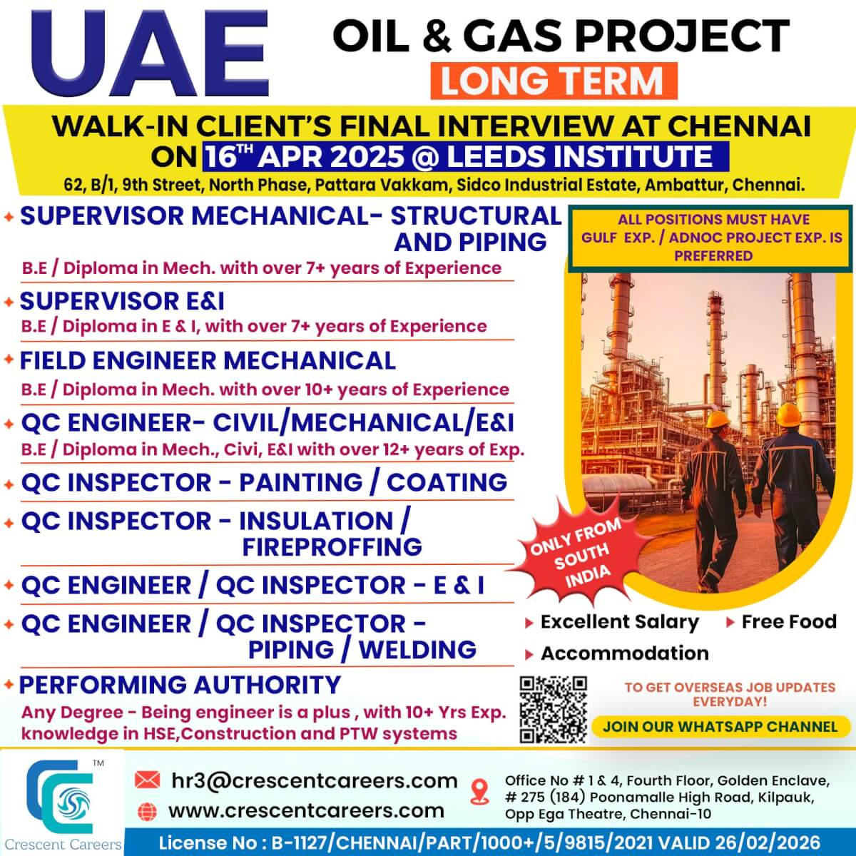 Hiring for Oil & Gas Project in QATAR LONG TERM WALK-IN CLIENT'S FINAL INTERVIEW AT TRICHY, CHENNAI, VIZAG Contact: +91-73387 58555 / 81223 11890 / 81222 68855 Send CV to: ...