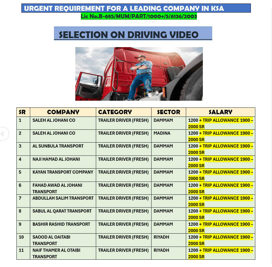 AUTO ELECTRICIAN (HEAVY TRUCK ) - RETURN / FRESH BOTH ACCEPTED  SALARY: 1800 - 2000 SR + OVERTIME  DUTY : 10 HOURS PASSPORT: ECR / ECNR BOTH ACCEPTED  SKILL TEST : REQUIRED  AGE LIMIT: 25 TO 40 YEARS    COMPANY BENEFITS:  ACCOMMODAION , TRANSPORTATION, ...
