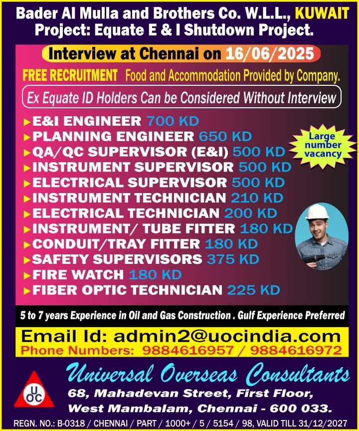 ? KOC Kuwait Long-Term Job Openings ? Interviews in Chennai, Cochin, Mumbai, Surat & Vadodara – Dec 2025 Immediate Departure | Apply Now: kuwait@uocindia.com #KuwaitJobs #OilAndGasCareers #ConstructionJobs #GulfJobs #OverseasJobs #LongTermProjects #KOCRecruitment...