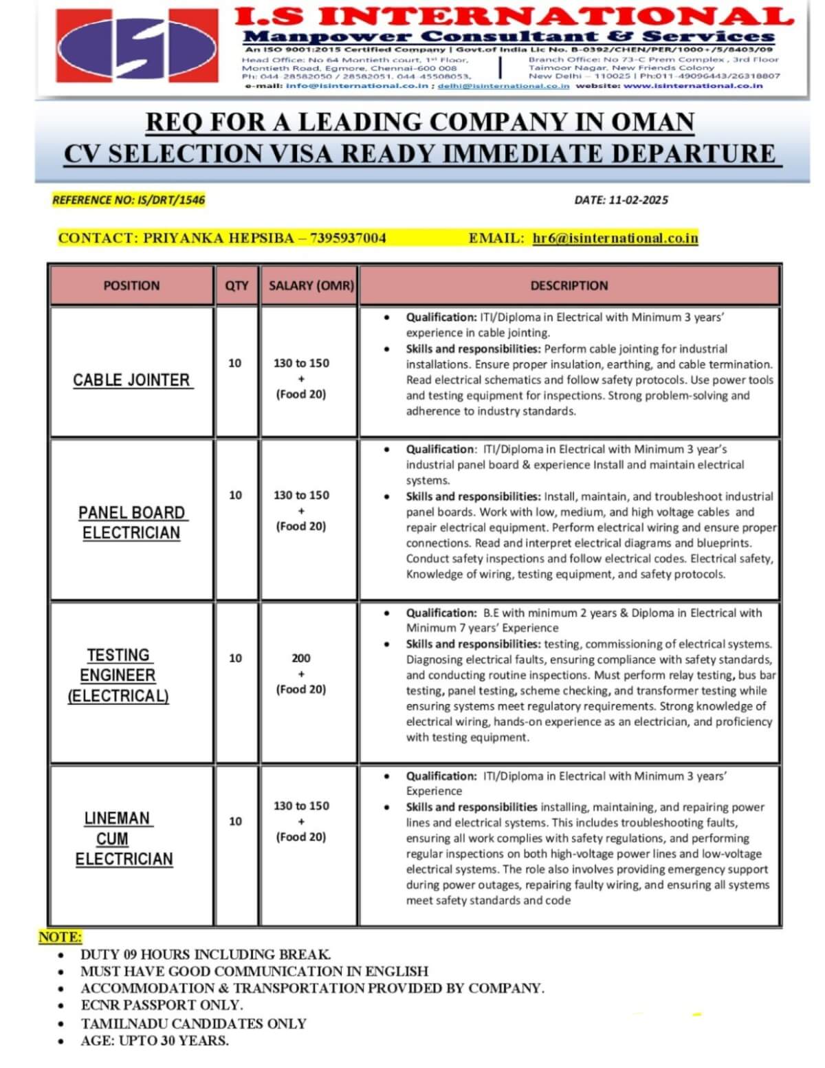 ELECTRICAL ENGINEER 3500 (500 FOOD) • B.E with minimum of 4 years’ experience • Design, supervise, and review electrical systems for industrial and building projects. • Oversee installation, testing, and commissioning of panels, transformers, generators,...