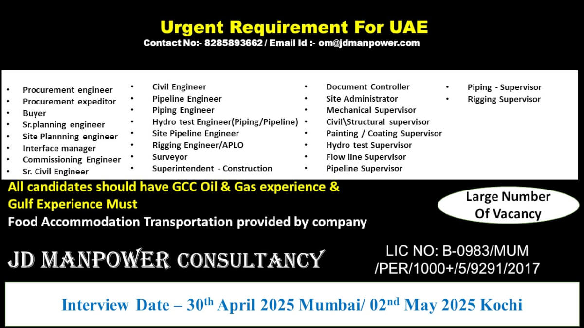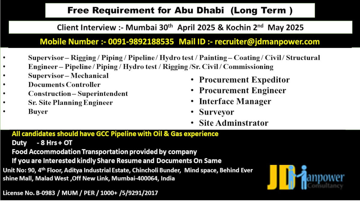 ? Job Opportunity Alert! ? Unlock new career opportunities!   JD Manpower Consultancy ? We are currently hiring for a UAE Long-Term Project in Oil & Gas Industry. ? Available Positions: * Fabricator Plate (Structure Fabricator) * Fitter Instrument ? Interview...