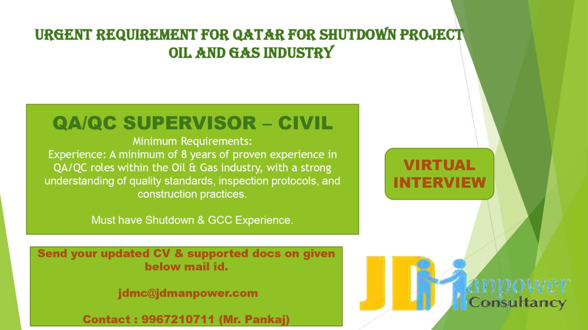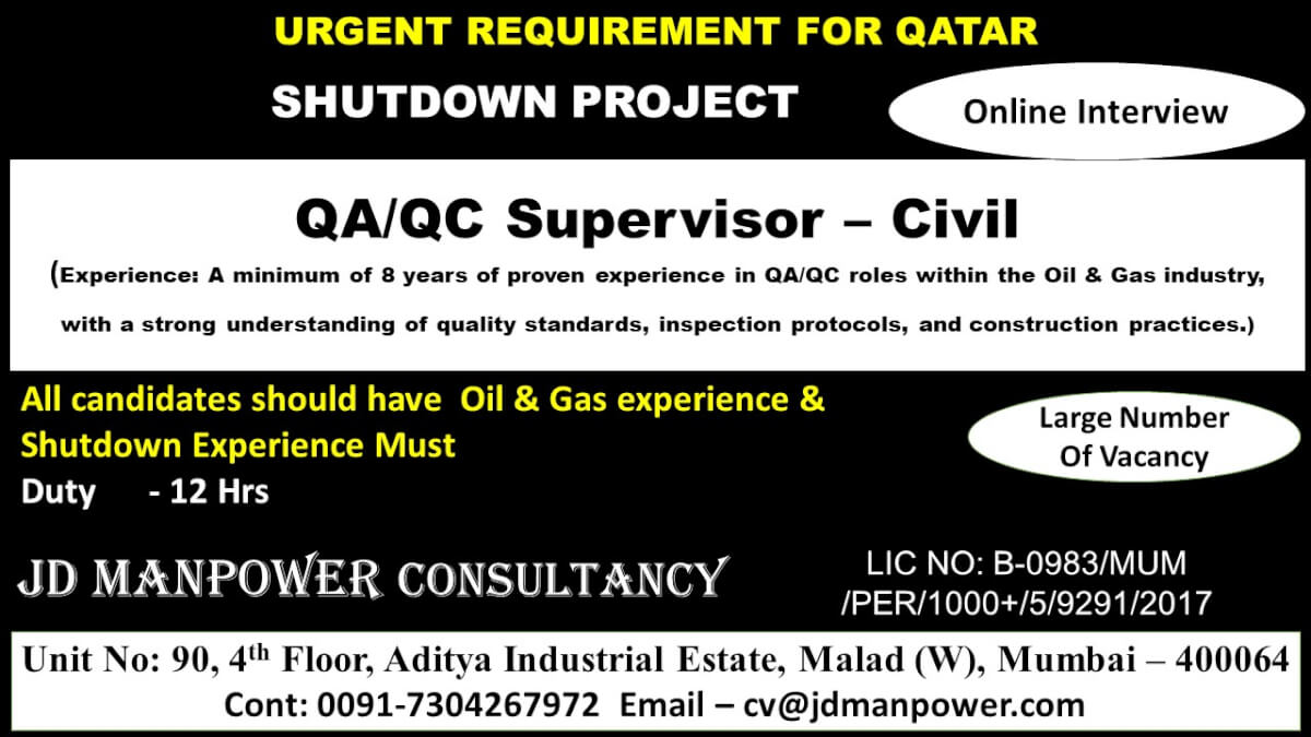 Greetings from JD MANPOWER CONSULTANCY  I do have vacancy in QATAR for MADINA GROUP. - free requirement  - 8 Hrs duty + OT - Food Accommodation and transport by company - Positions :-  1) Lead QC Inspector - E&I - Long term - 8 Years Experience 2) QC Inspector...