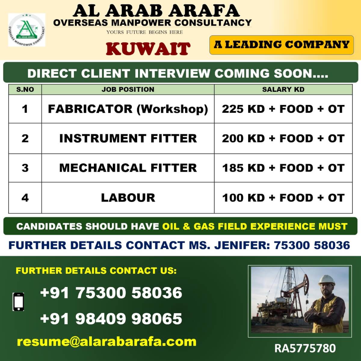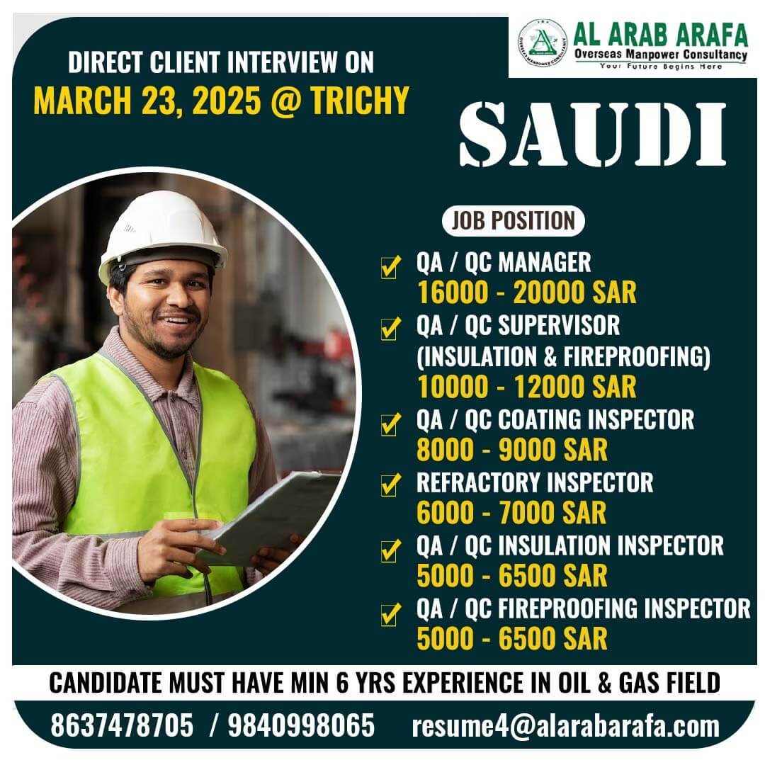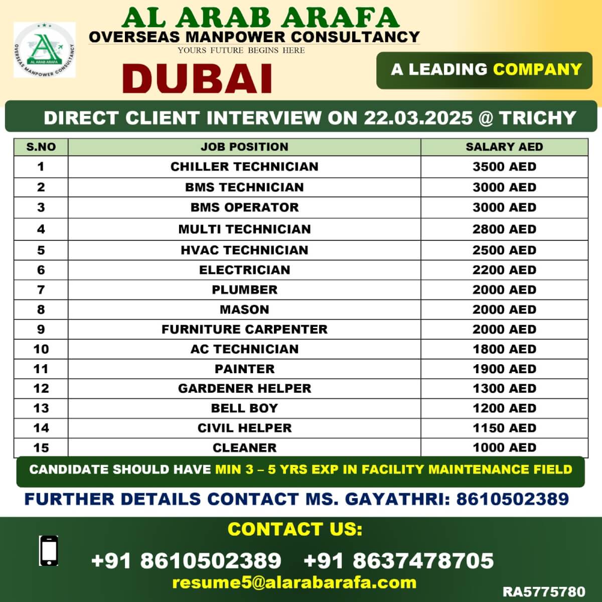 FURTHER DETAILS CONTACT MS.KALISH - 9840998065 EMAIL ID - resume3@alarabarafa.com