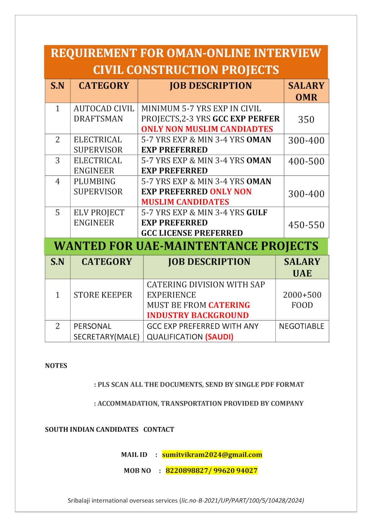 WANTED FOR OMAN –ONLINE INTERVIEW