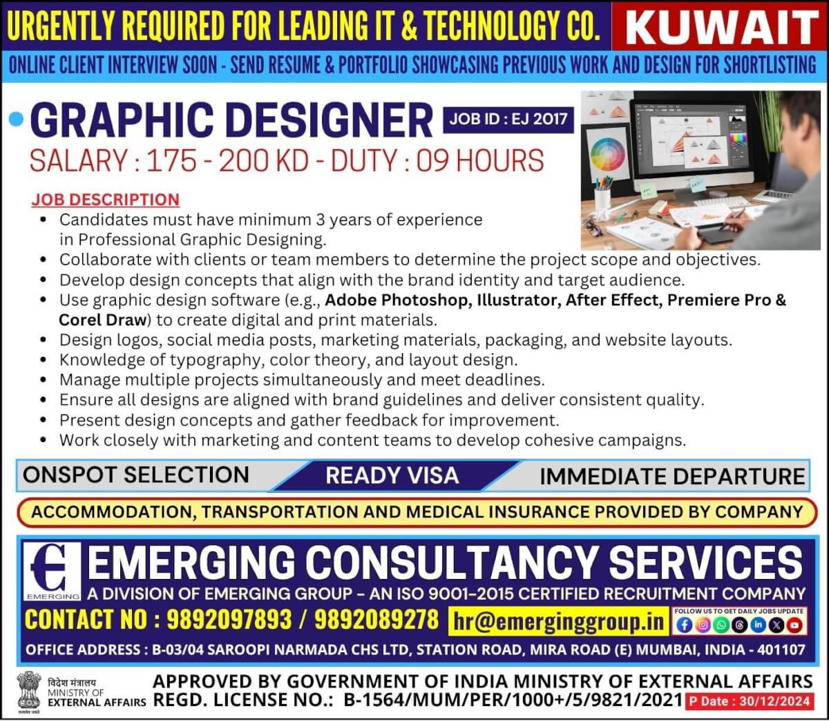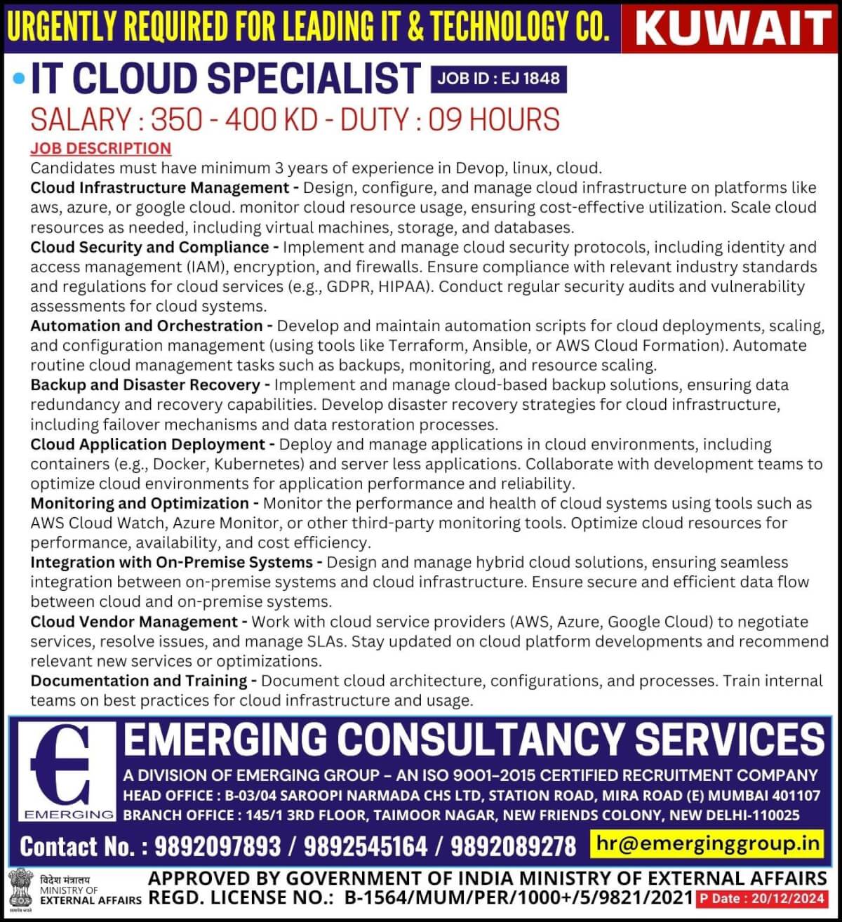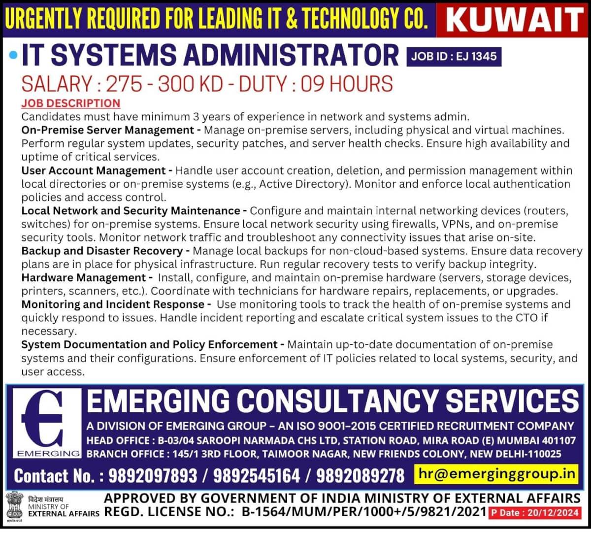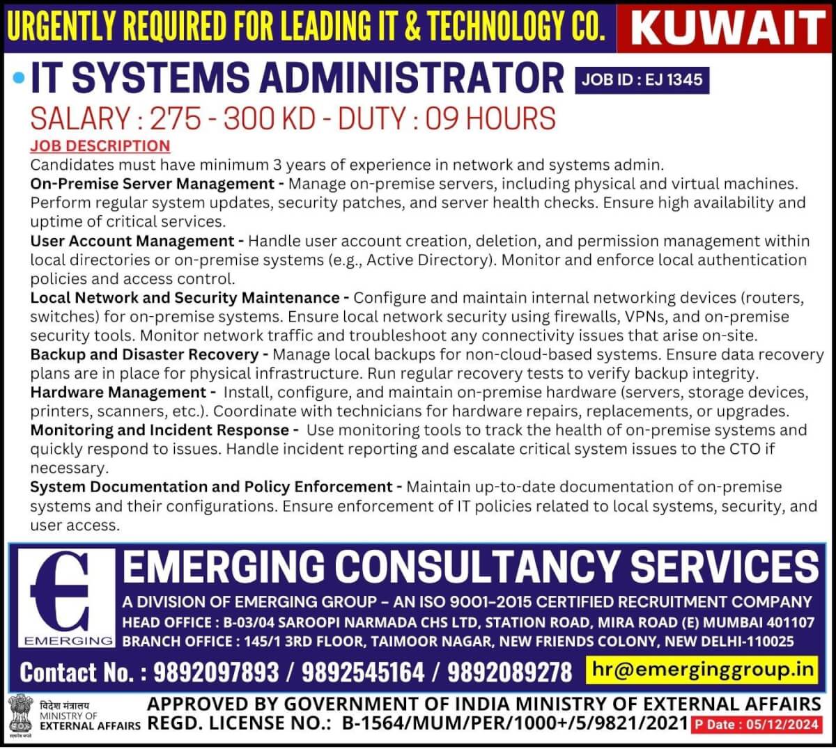 Hiring for leading IT & Technology Company in Kuwait - Shortlisting in Progress IT SYSTEM ADMINISTRATOR To apply kindly mail your updated Resume and Documents to : hr@emerginggroup.in For any inquiry call between (10:30 AM – 05:30 PM – MON-SAT)...