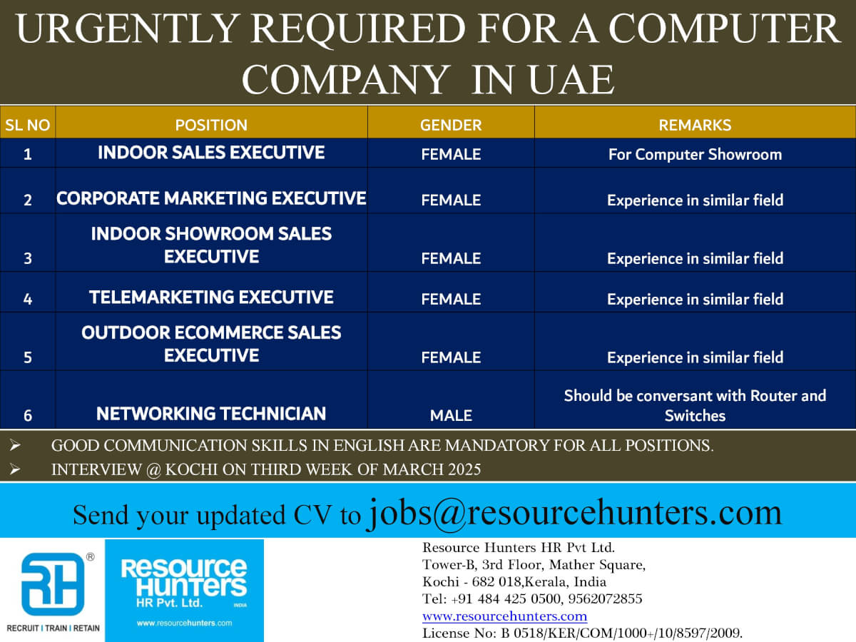 URGENTLY HIRING FOR ABU DHABI TELECOM INDUSTRY (GOVT MAINTENANCE PROJECT) / 7299792636 / jobslucky@gmail.com